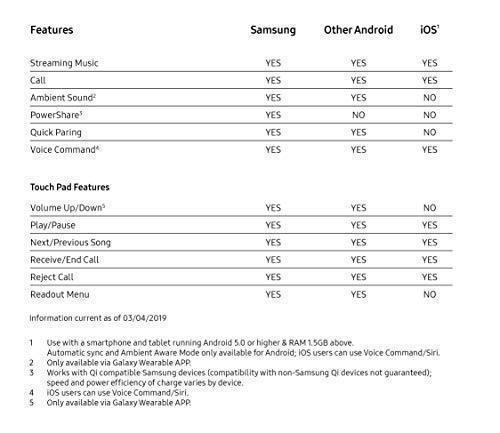 • The Galaxy Buds pairs with both Android and iOS compatible devices via Bluetooth connection. Use with a smartphone and tablet running Android 5. 0 or higher & RAM 1. 5GB above. Automatic sync and Ambient Aware Mode only available for Android; iOS users can use Voice Command/Siri